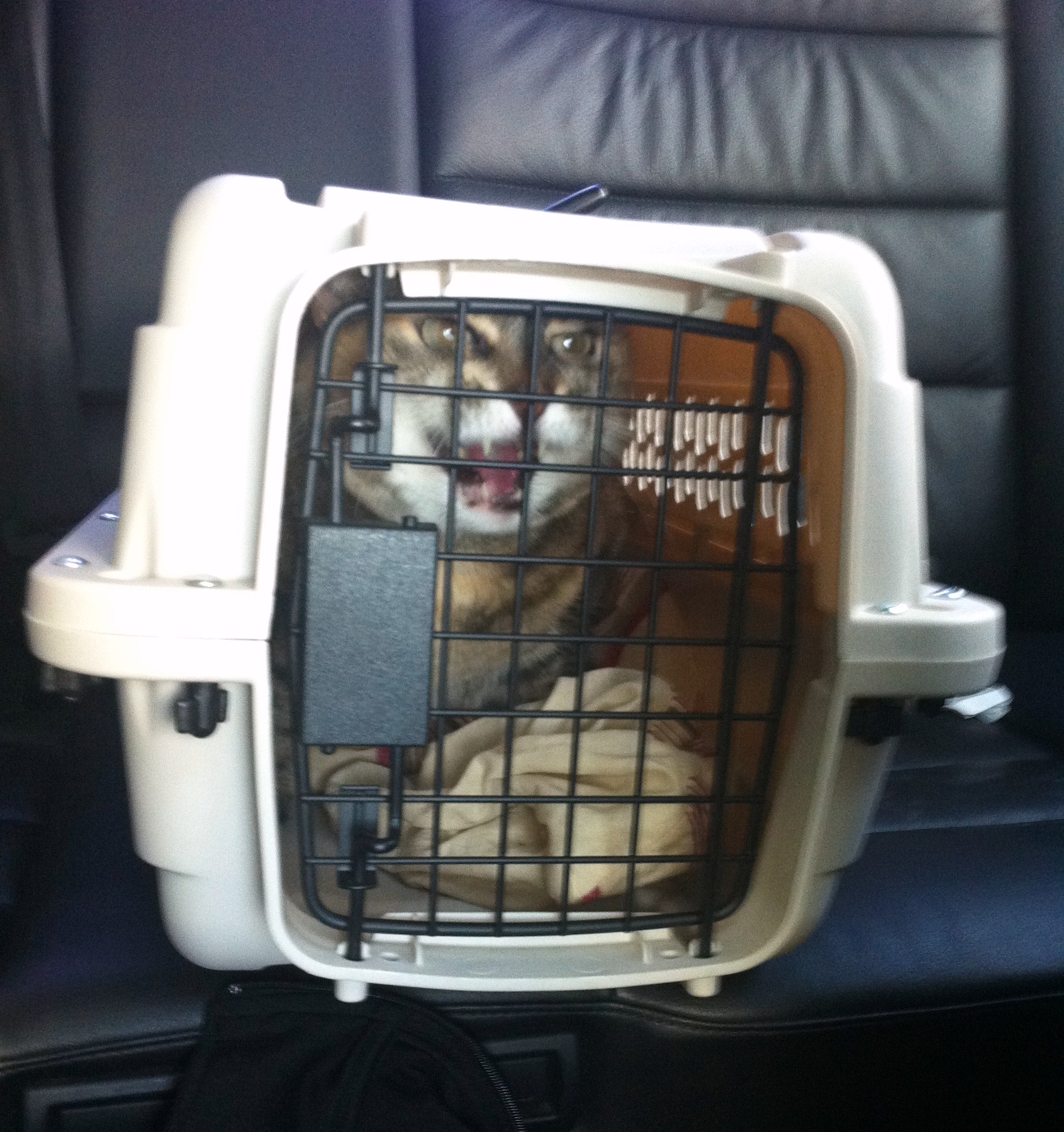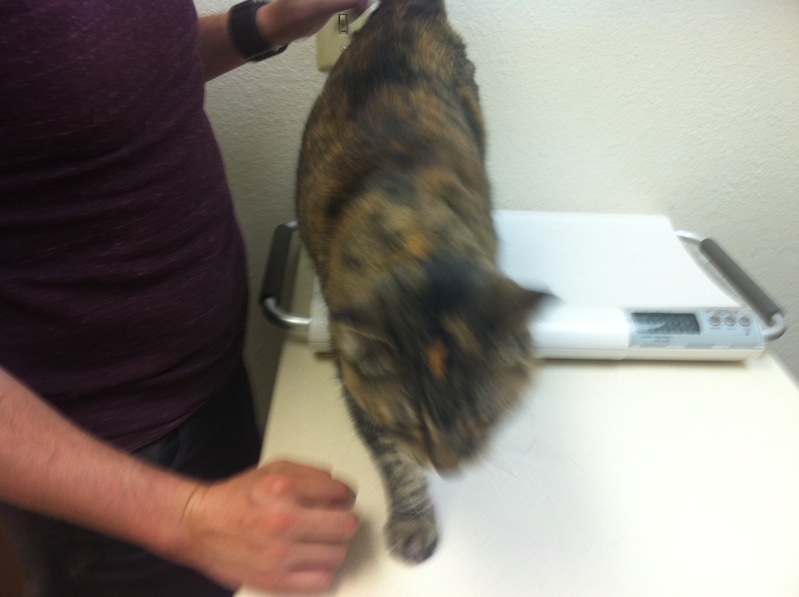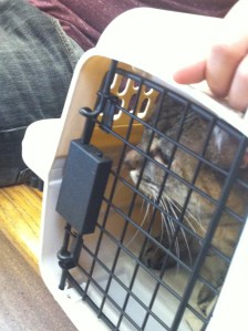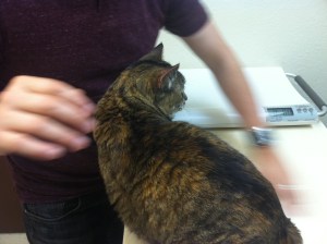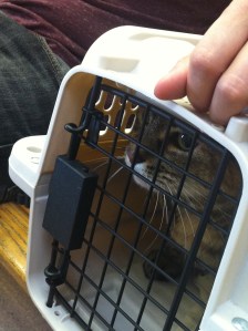 I had my cats for a year in Feb. So I took them for their yearly since my cousin didn’t have them long enough for all that when she gave them to me. So we were in there, they were not happy being in the cage. It’s a big enough carrier for them both. So they were meowing. Now when they were doing the exam and I saw the thermometer I was like OMG I can’t look, but their faces were like WHOA buddy watch what your doing. But they were good, so I was happy. :0)