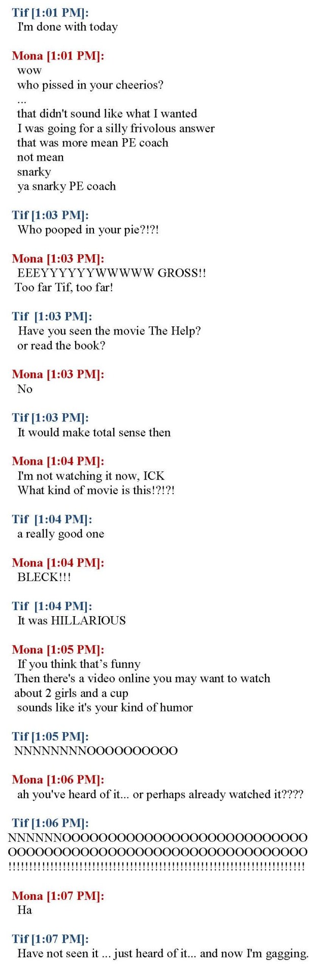 This entry was posted in Facebook/IM Dialogue, Humor and tagged 2 girls and cup, cheerios, co-worker, funny, gag, gross, Humor, ick, iming, online, video, wrong. Bookmark the permalink.