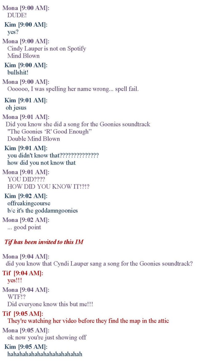 I lived in the 80’s and I had no idea that Cyndi Lauper sang a song on The Goonies. I just asked a friend and even SHE knew it. Then again I haven’t seen The Goonies from start to finish so….