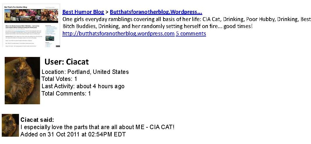 The straw that broke this bloggers back was when I discovered CIA Cat had voted for me for Best Humor Blog in the Blogger’s Choice Awards.