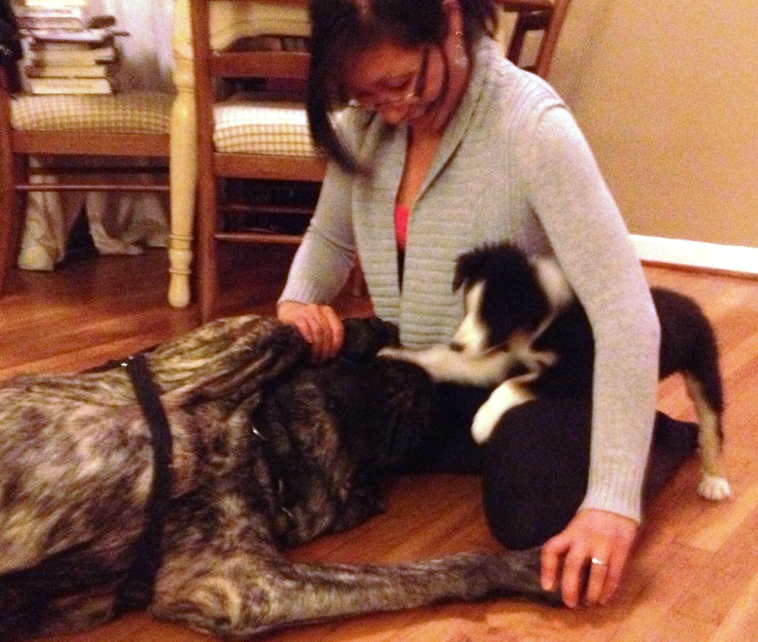 So Orko, my 7.5 pound mini Australian puppy, had his very first doggy play date last weekend… with Nigel… the 160 pound English Mastiff… ya.