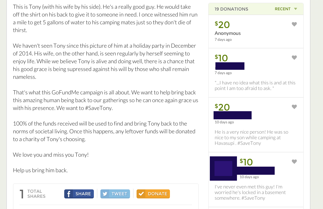 They created a GoFundMe page to find my husband!!!!!! Once he’s found they will donate the money to a charity of Hubby’s choice… FOR FUCKS SAKE!!!!!!
